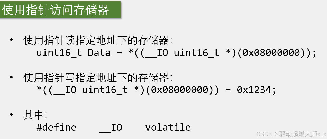 ③ *( (__IO uint16_t *)(0x08000000) ) = 0x1234; 注意STM32只能以半字16位的形式写入。
