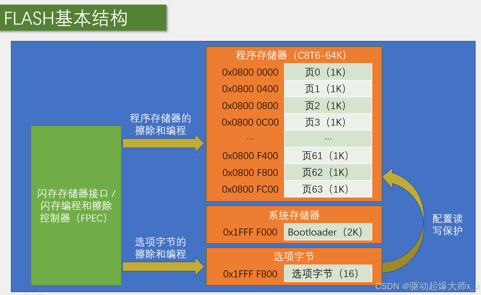 这里是Flash的基本结构图,使用FPEC(Flash Program/Erase Controller)外设对Flash进行擦除和编程。程序存储器存储的是一些代码程序,而系统存储器是出厂自带的信息,选项字节用来配置读写保护和其他用户配置。