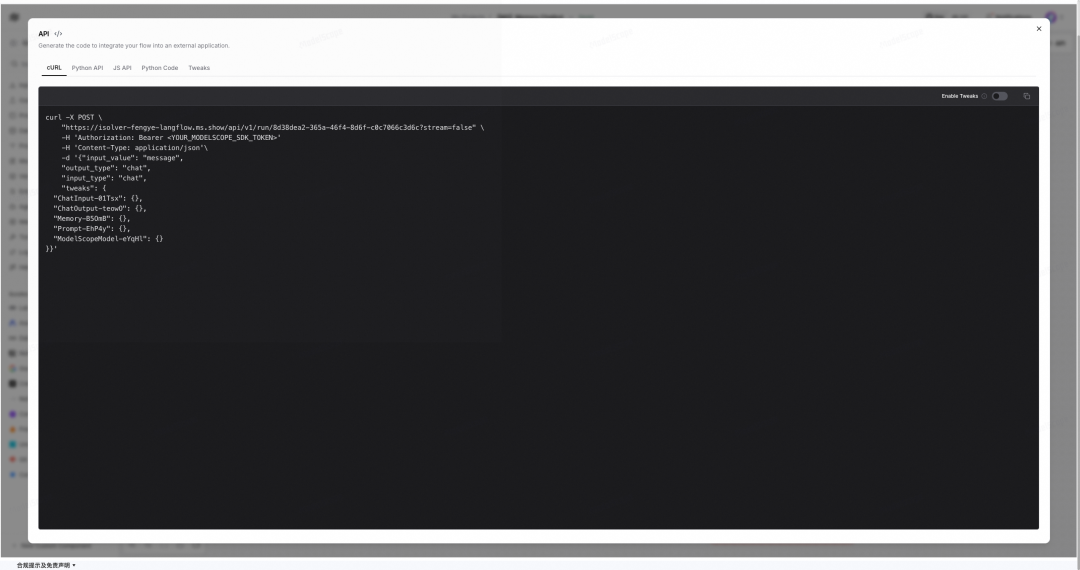 您也可以点击 API 查看调用工作流API的示例,参考指引补充填写 ModelScope SDK Token 后可以成功调用API: