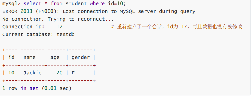 查看事务锁的超时时长,默认 50s, 也就是说,超过 50 秒之后,事务会自动断开,事务过程中的操作也会自动消失