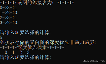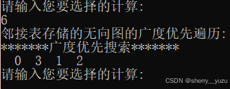 分析:输入数字5后进入该邻接表存储的无向图的深度优先非递归遍历的功能。提示用户深度优先搜索的结果为,表示刚刚建立的无向图的深度优先搜索的结果。经查看刚刚建立的邻接表应有的输出结果一致。接着提示用户继续选择想要的计算。