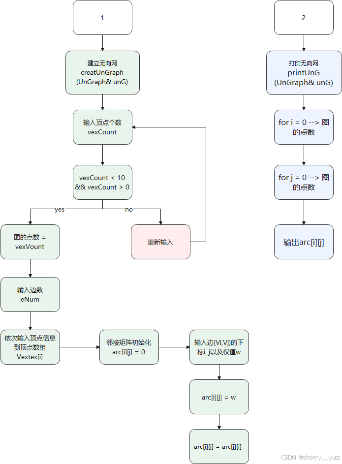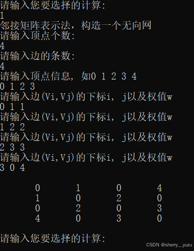 void creatUnGraph(UnGraph& unG) {int vexCount; // 顶点数int i, j, w; // 点、边下标、权while (true) {cout << "请输入顶点个数: " << endl;cin >> vexCount;if (vexCount < 10 && vexCount > 0) {unG.vexNum = vexCount;break;}else {cout << "您输入的顶点个数有误,请重新输入" << endl; }}cout << "请输入边的条数: " << endl;cin >> unG.eNum;cout << "请输入顶点信息, 如0 1 2 3 4 " << endl;for (int i = 0; i < unG.vexNum; i++) {cin >> unG.Vertex[i];}// 邻接矩阵初始化for (int i = 0; i < unG.vexNum; i++) {for (int j = 0; j < unG.vexNum; j++) {unG.arc[i][j] = 0;}}// 输入邻接矩阵信息for (int k = 0; k < unG.eNum; k++) {cout << "请输入边(Vi,Vj)的下标i, j以及权值w" << endl;cin >> i >> j >> w;unG.arc[i][j] = w;// 无向网的邻接矩阵对称unG.arc[j][i] = unG.arc[i][j];}