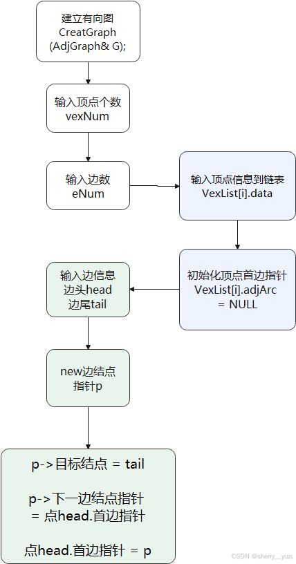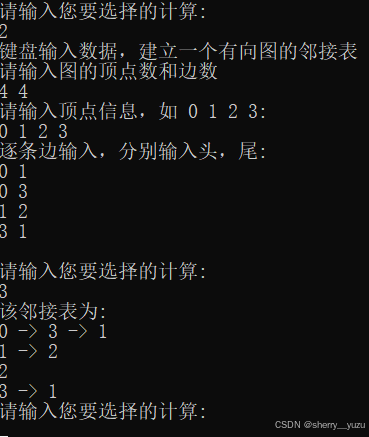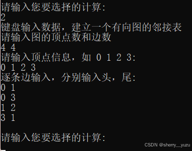 {int head; // 边头int tail; // 边尾cout << "请输入图的顶点数和边数" << endl;cin >> G.vexNum >> G.eNum;cout << "请输入顶点信息,如 0 1 2 3:\n";for (int i = 0; i < G.vexNum; i++) // 输入顶点信息{cin >> G.VexList[i].data;G.VexList[i].adjArc = NULL; // 初始化顶点的第一条边}cout << "逐条边输入,分别输入头,尾:\n";for (int i = 0; i < G.eNum; i++){cin >> head >> tail; // 逐边输入arcNode* p = new arcNode;p->ajdVex = tail;p->nextArc = G.VexList[head].adjArc;G.VexList[head].adjArc = p;}