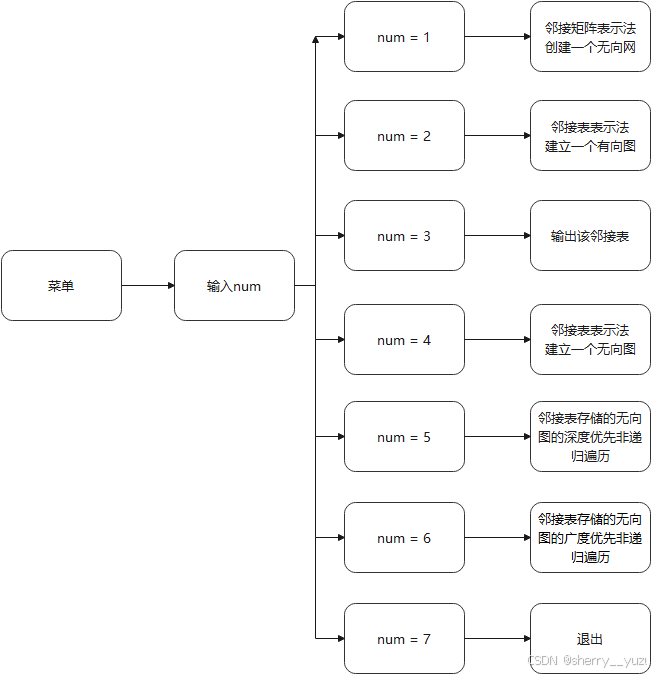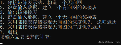 编译后首先出现一个菜单,1-7有文字信息描述图的相关算法,提示用户输入1-7之间的数字。输入数字1,代表邻接矩阵表示法,构造一个无向网;输入数字2,代表键盘输入数据,建立一个有向图的邻接表;输入数字3,提示输出的结果为“有向图的邻接表”;输入数字4,代表键盘输入数据,建立一个无向图的邻接表并打印;输入数字5,提示输出的结果为“邻接表存储的无向图的深度优先非递归遍历”;输入数字6,提示输出的结果为“邻接表存储的无向图的广度优先遍历”;输入数字7,系统退出,提示用户“退出成功!”;输入其他数字,提示用户"输入有误!请重新输入!"。