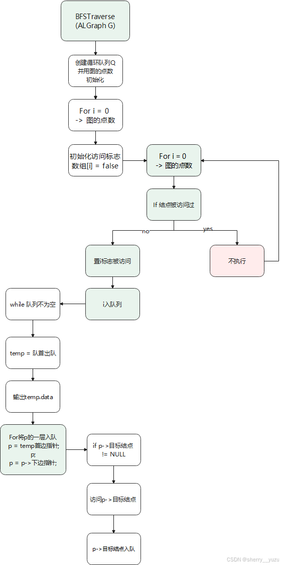 首先初始化该访问标志所有元素为false代表所有元素都未被访问,然后再for循环一个个访问未被访问过的顶点,进行广度遍历。利用队列将一点所在的一层链接的边结点全部入队。