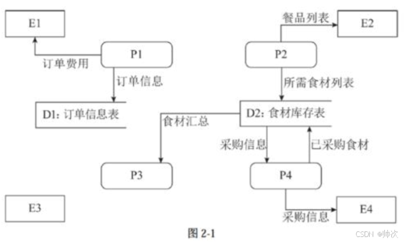 根据订餐管理系统功能说明,请在图 2-1所示数据流图中给出外部实体 E1~E4 和加工 P1~P4 的具体名称。