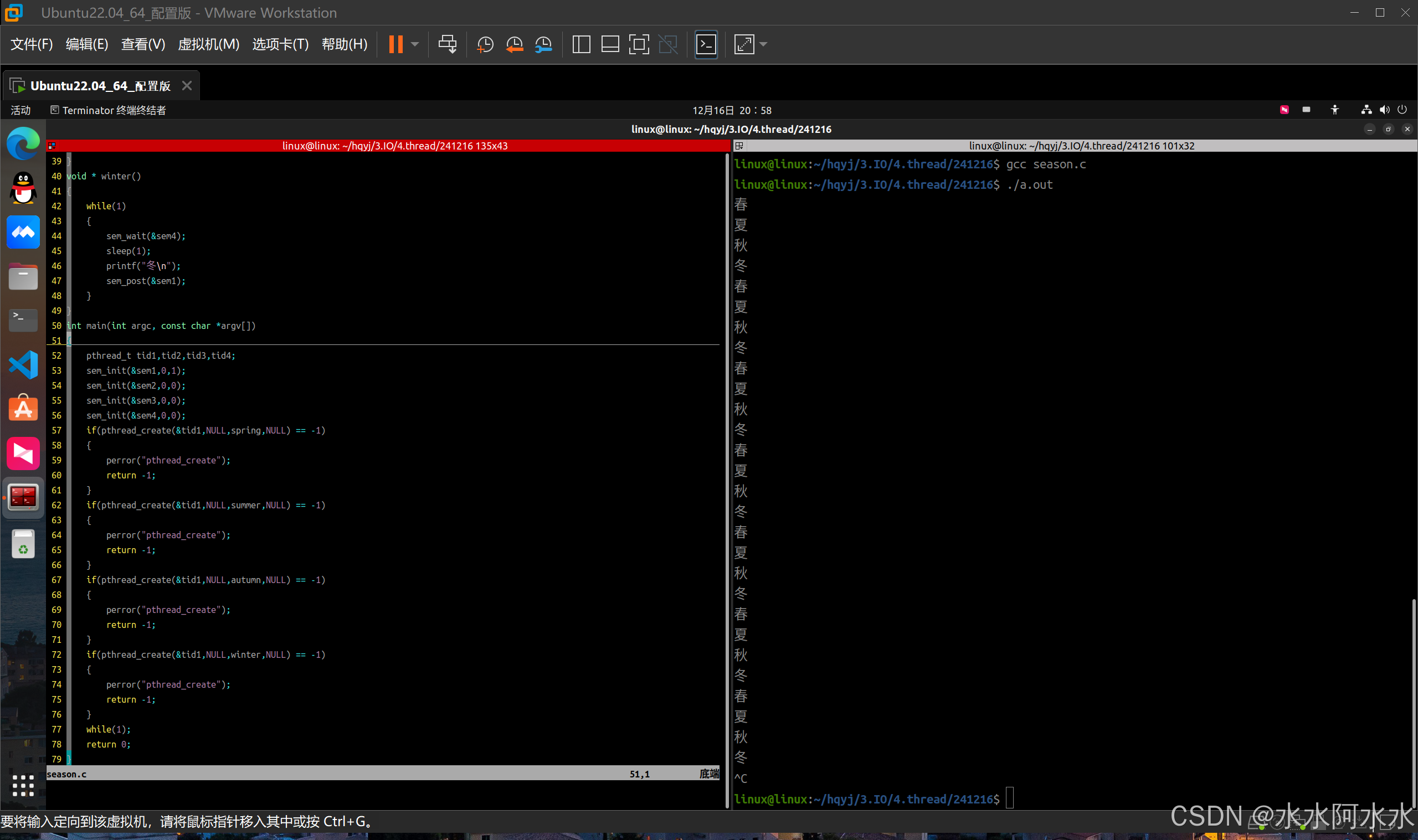 /*******************************************************/ //=> File Name: season.c //=> Author: Water //=> Mail: 1249496568@qq.com //=> Created Time: 2024年12月16日 星期一 20时44分46秒 /*******************************************************/#include<myhead.h> sem_t sem1,sem2,sem3,sem4; void * spring() {while(1){sem_wait(&sem1);sleep(1);printf("春\n");sem_post(&sem2);} } void * summer() {while(1){sem_wait(&sem2);sleep(1);printf("夏\n");sem_post(&sem3);} } void * autumn() {while(1){sem_wait(&sem3);sleep(1);printf("秋\n");sem_post(&sem4);} } void * winter() {while(1){sem_wait(&sem4);sleep(1);printf("冬\n");sem_post(&sem1);} } int main(int argc, const char *argv[]) {pthread_t tid1,tid2,tid3,tid4;sem_init(&sem1,0,1);sem_init(&sem2,0,0);sem_init(&sem3,0,0);sem_init(&sem4,0,0);if(pthread_create(&tid1,NULL,spring,NULL) == -1){perror("pthread_create");return -1;}if(pthread_create(&tid1,NULL,summer,NULL) == -1){perror("pthread_create");return -1;}if(pthread_create(&tid1,NULL,autumn,NULL) == -1){perror("pthread_create");return -1;}if(pthread_create(&tid1,NULL,winter,NULL) == -1){perror("pthread_create");return -1;}while(1);return 0; }