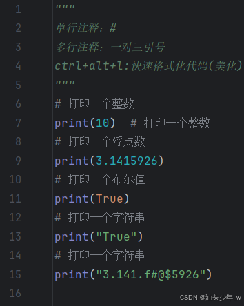 多行注释:一对三引号在PyCharm中ctrl+alt+l:快速格式化代码(美化)