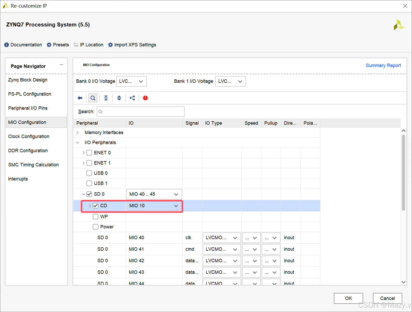 system-> SD0 // MIO40..MIO45-> SD0.CD // MIO10(参考硬件原理图) SD.CD信号是TF卡检测信号,用于标志开发板是否连接了TF卡。# Bank1的IO电压为1.8V