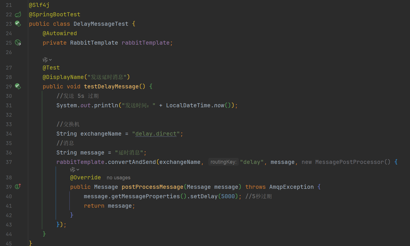 public class DelayMessageTest {@Autowiredprivate RabbitTemplate rabbitTemplate;@Test@DisplayName("发送延时消息")public void testDelayMessage() {//发送 5s 过期System.out.println("发送时间:" + LocalDateTime.now());//交换机String exchangeName = "delay.direct";//消息String message = "延时消息";rabbitTemplate.convertAndSend(exchangeName, "delay", message, new MessagePostProcessor() {@Overridepublic Message postProcessMessage(Message message) throws AmqpException {message.getMessageProperties().setDelay(5000); //5秒过期return message;}});}