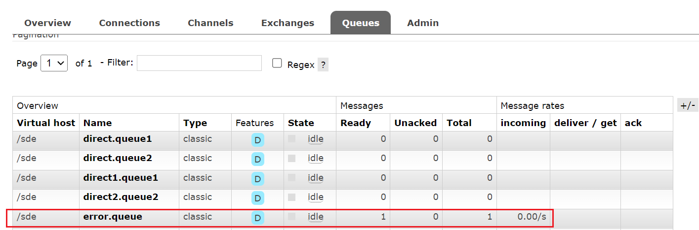 由于direct.queue1与hmall.direct绑定的key是blue,因此最终消息被成功路由到direct.queue1,如果此时有消费者与direct.queue1绑定, 也就能成功消费消息了。但此时已经是5秒钟以后了: