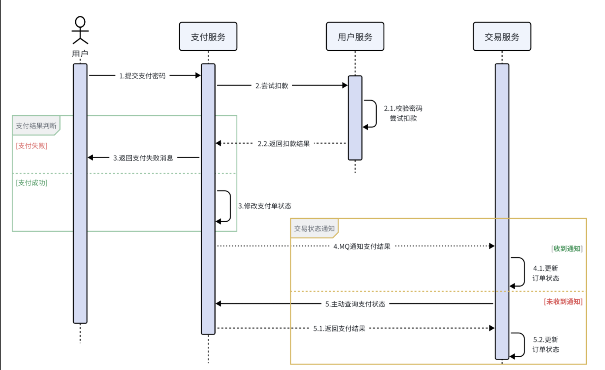图中黄色线圈起来的部分就是MQ通知失败后的兜底处理方案,由交易服务自己主动去查询支付状态。
