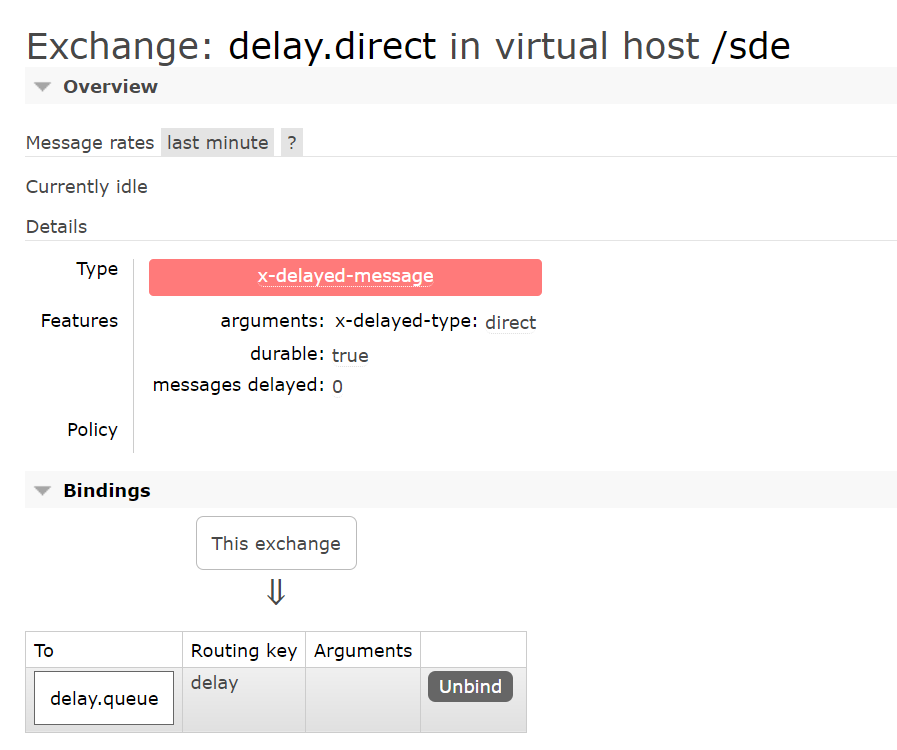 public class DelayExchangeConfig {@Beanpublic DirectExchange delayDelayExchange(){return ExchangeBuilder.directExchange("delay.direct").delayed().durable(true).build();}@Beanpublic Queue delayQueue(){return new Queue("delay.queue");}@Beanpublic Binding delayBinding(Queue delayQueue, DirectExchange delayDelayExchange){return BindingBuilder.bind(delayQueue).to(delayDelayExchange).with("delay");}}
