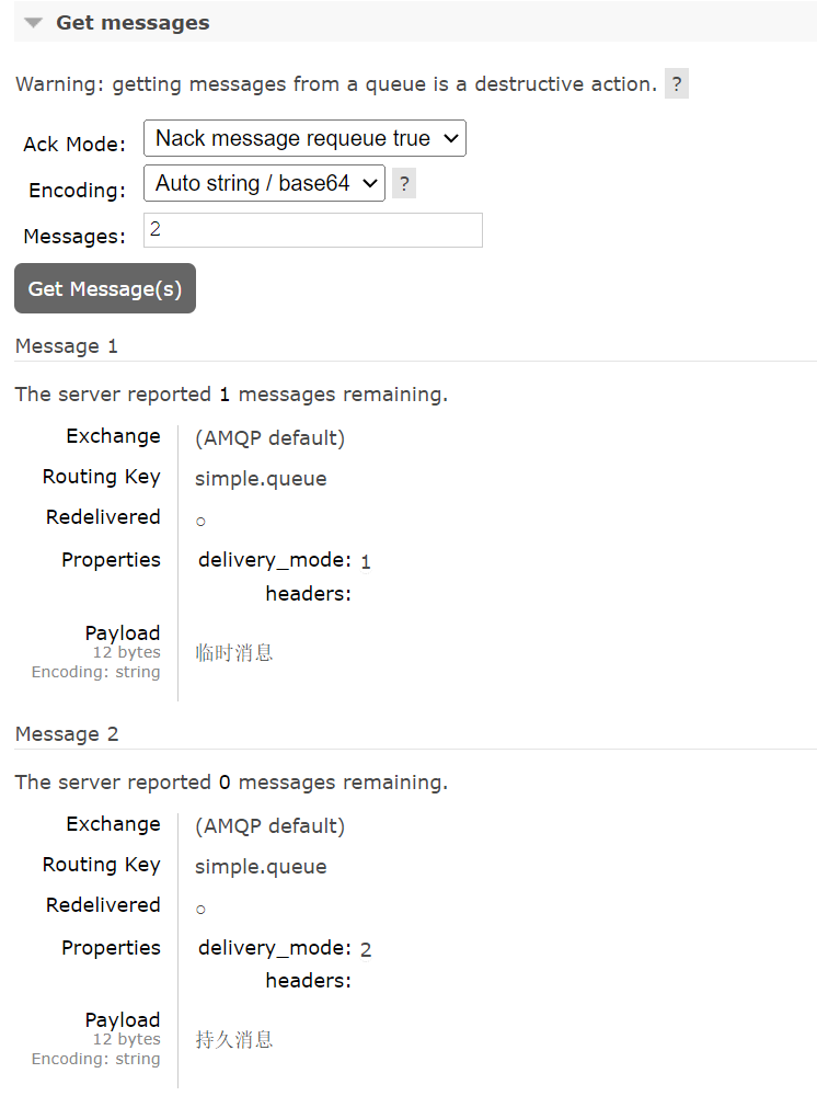 在控制台发送消息的时候,可以添加很多参数,而消息的持久化是要配置一个Delivery mode: