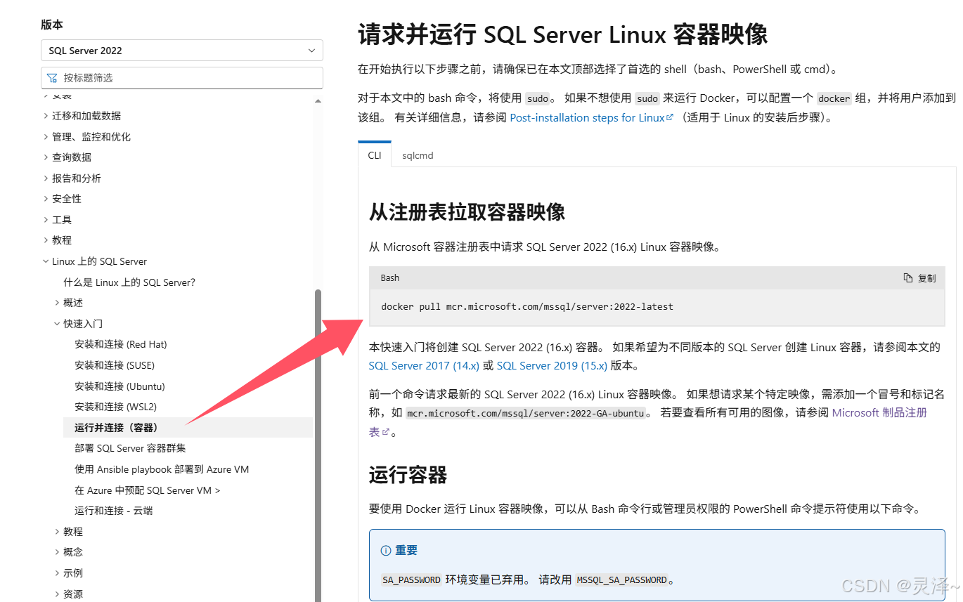 1、可以直接参考微软官方文档 快速入门:使用 Docker 运行 SQL Server Linux 容器映像,这里主要是说一些注意点和坑